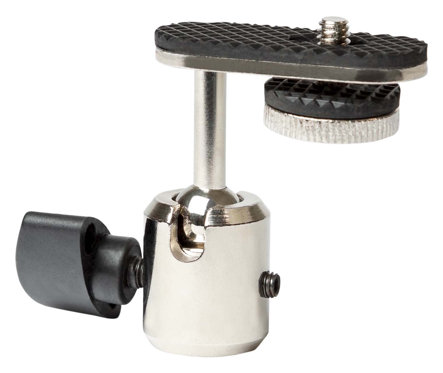 Universal adapter for cameras, digital recorders, “action cameras-inch and other devices with 1/4-inch screw. Suitable for mounting on a mic stand with standard 5/8-inch thread. Broadest possible adjustments. Available in chrome finish.
