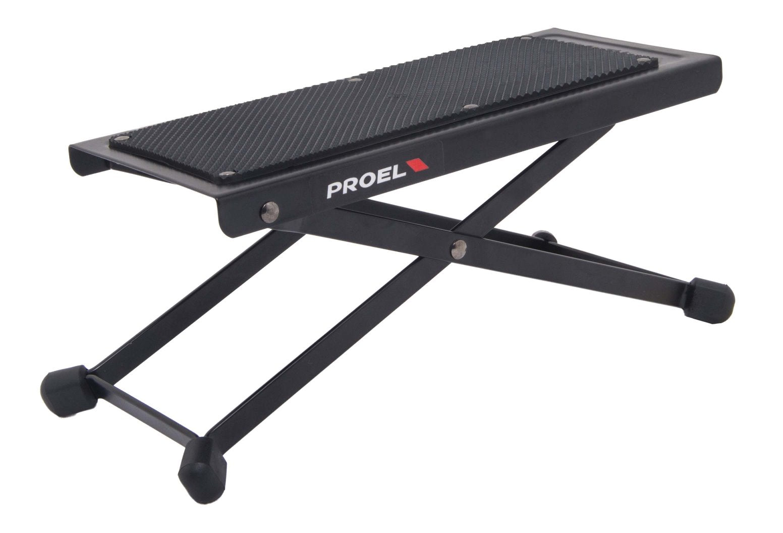 Folding footrest for guitarist. 4 position - height adjustable. Non-skid rubber top. Available in matte black finish.