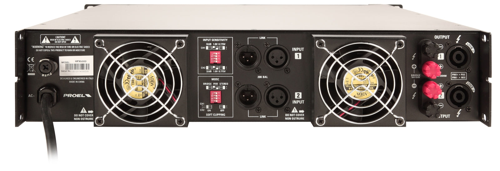 Light-weight and easily manageable, the HPX series amplifiers offer practicality as one of their primary features. Their switching mode power supplies and efficient cooling systems make them particularly suited for use in compact and portable systems and, at the same time, make them reliable and durable even after years of intense use. Thanks to the combination of an efficient 3-tier CLASS H power stage and a reliable switching power supply, the HPX6000 can deliver 6000 watts total at 2 ohm load making it a very convenient source of power in even the most demanding sound reinforcement applications. With an overall efficiency higher than 75% and a comprehensive set of controls, including a 3-position GAIN selector and switchable SOFT CLIP LIMITERS, the HPX6000 represents a cost-effective solution also for large sound reinforcement systems requiring very high power levels combined to top quality performance. The front panel, which offers convenient, die-cast handles and a removable dust filter, provides a comprehensive system of LED status indicators and indexed level controls.