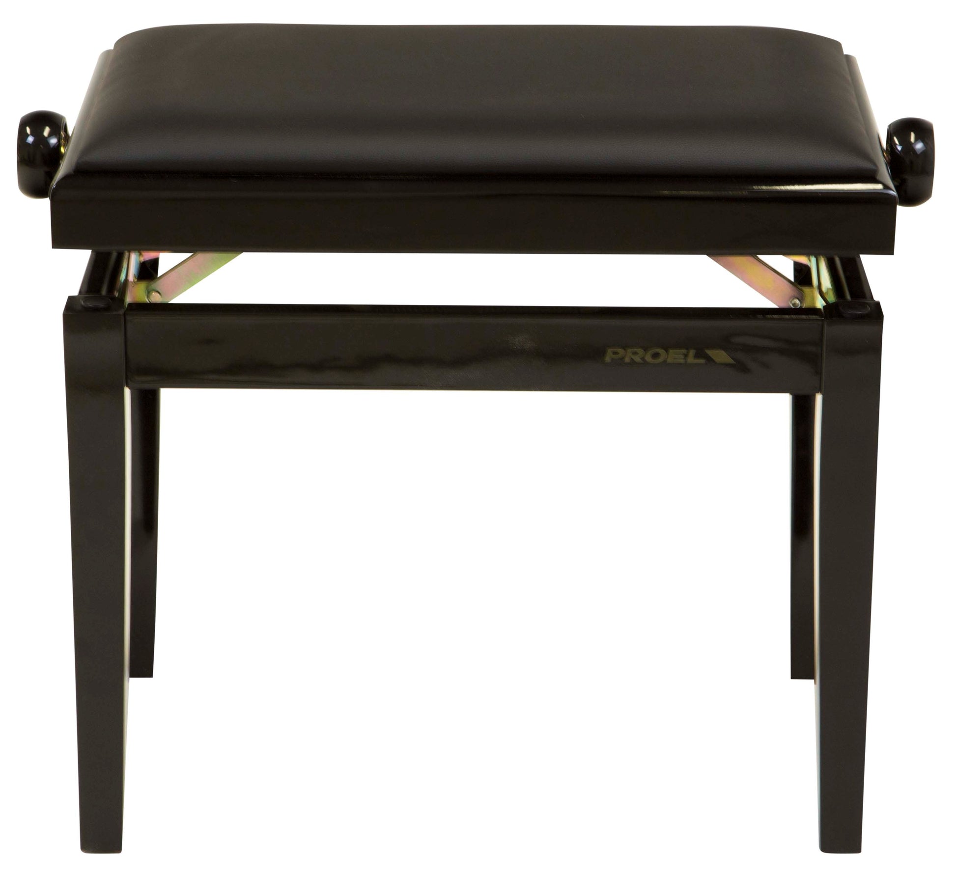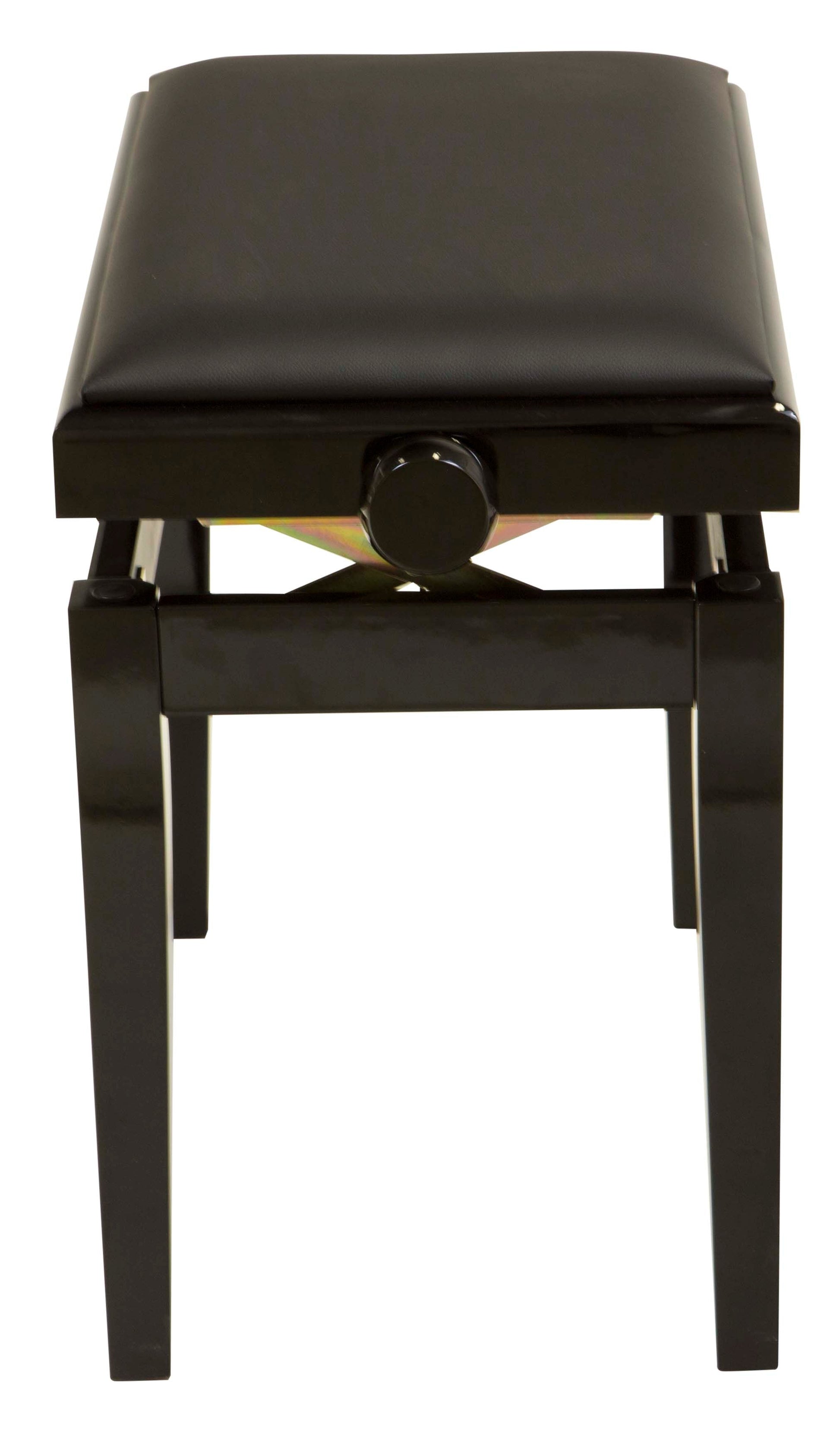 Height adjustable professional wooden bench for piano and organ, single padded seat with imitation leather cover, steel mechanics with tropicalized finish, comfortable height adjusting knobs. Polished black frame. Padded seat with black imitation leather covering.