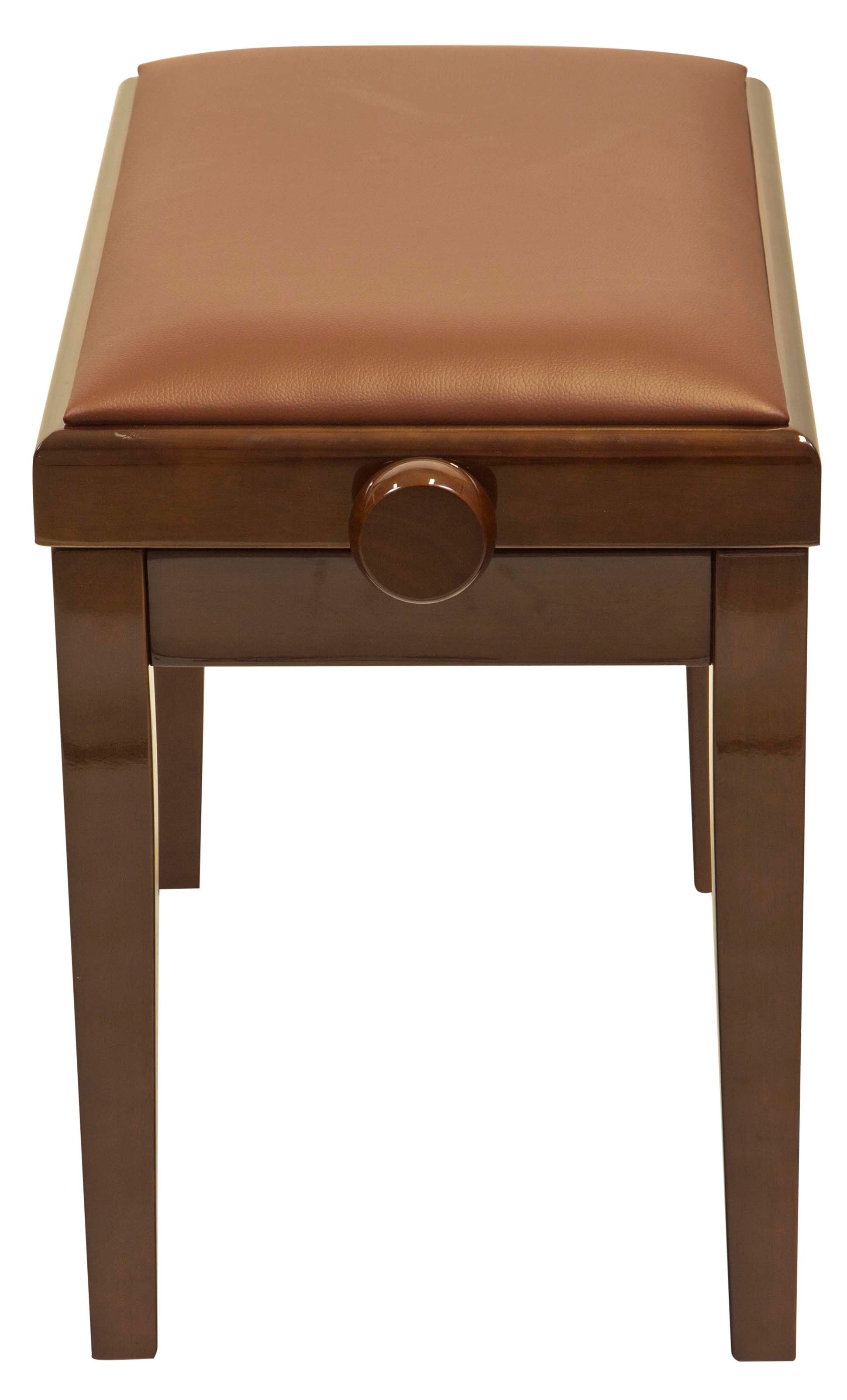 Height adjustable professional wooden bench for piano and organ, single padded seat with imitation leather cover, steel mechanics with tropicalized finish, comfortable height adjusting knobs. Polished walnut frame. Padded seat with brown imitation leather covering.