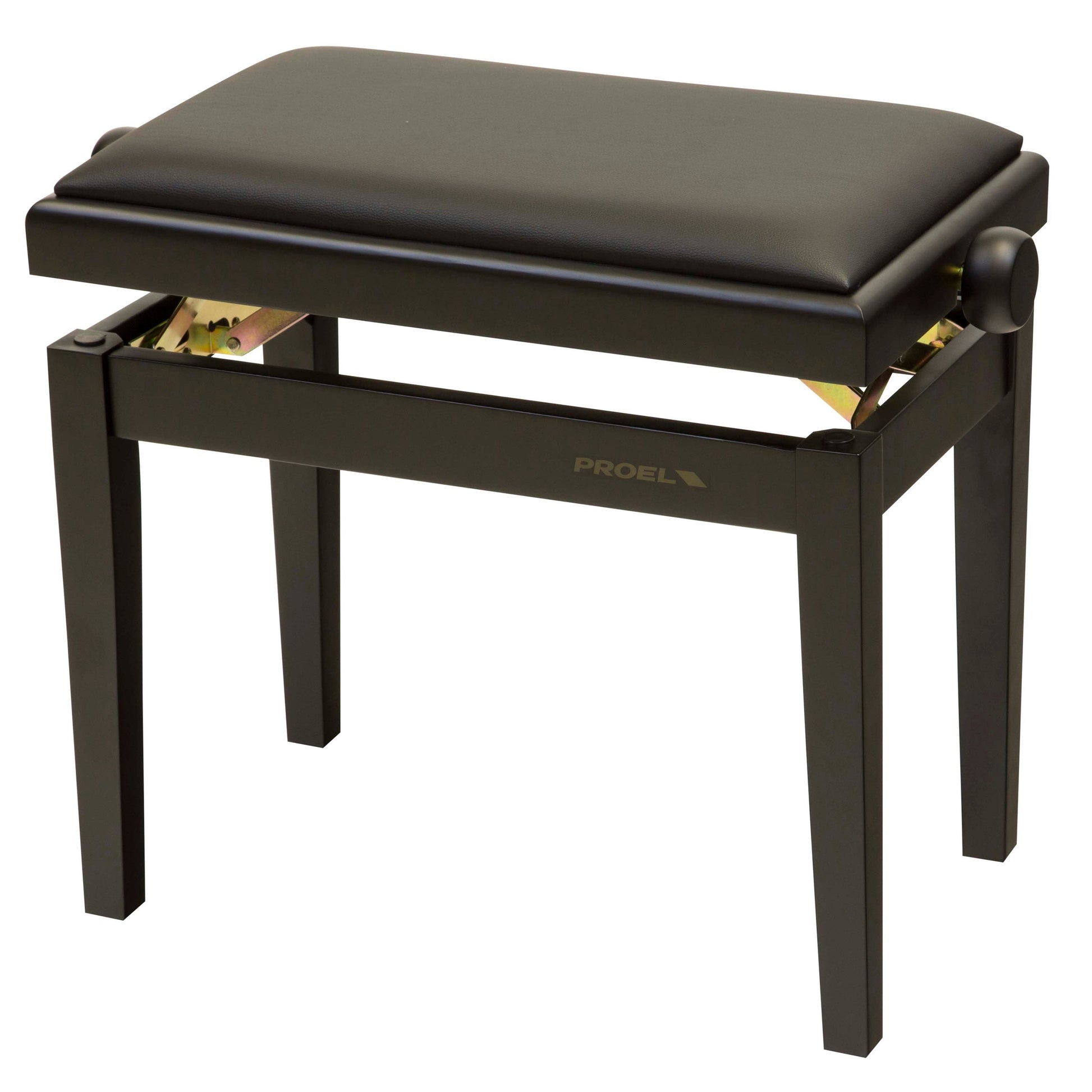 Height adjustable professional wooden bench for piano and organ, single padded seat with imitation leather cover, steel mechanics with tropicalized finish, comfortable height adjusting knobs. Matte black frame. Padded seat with black imitation leather covering.