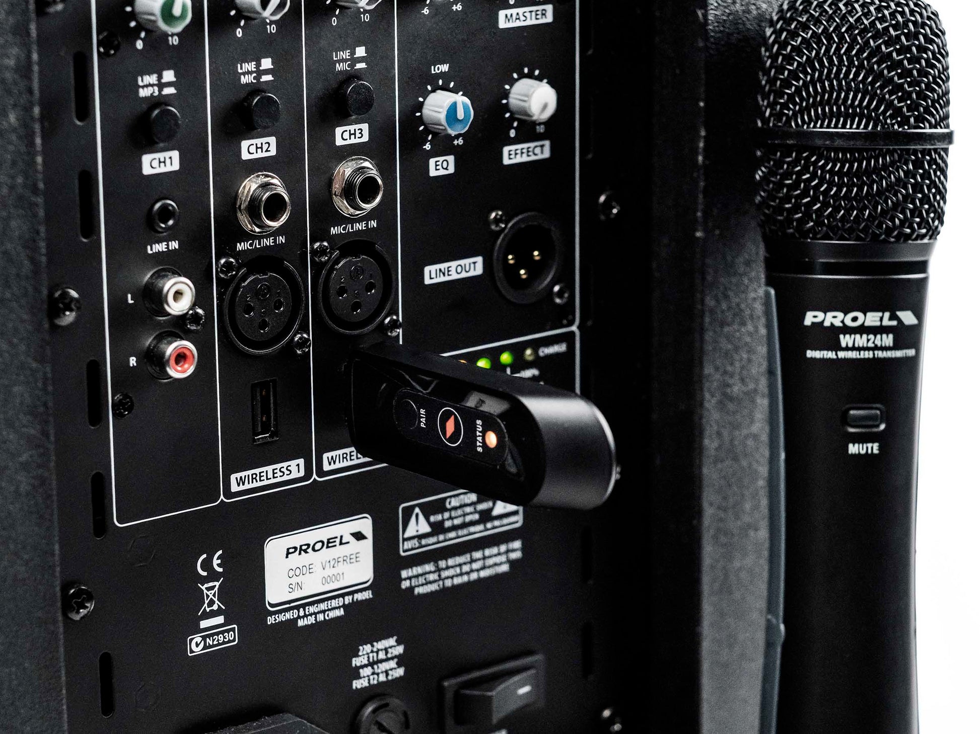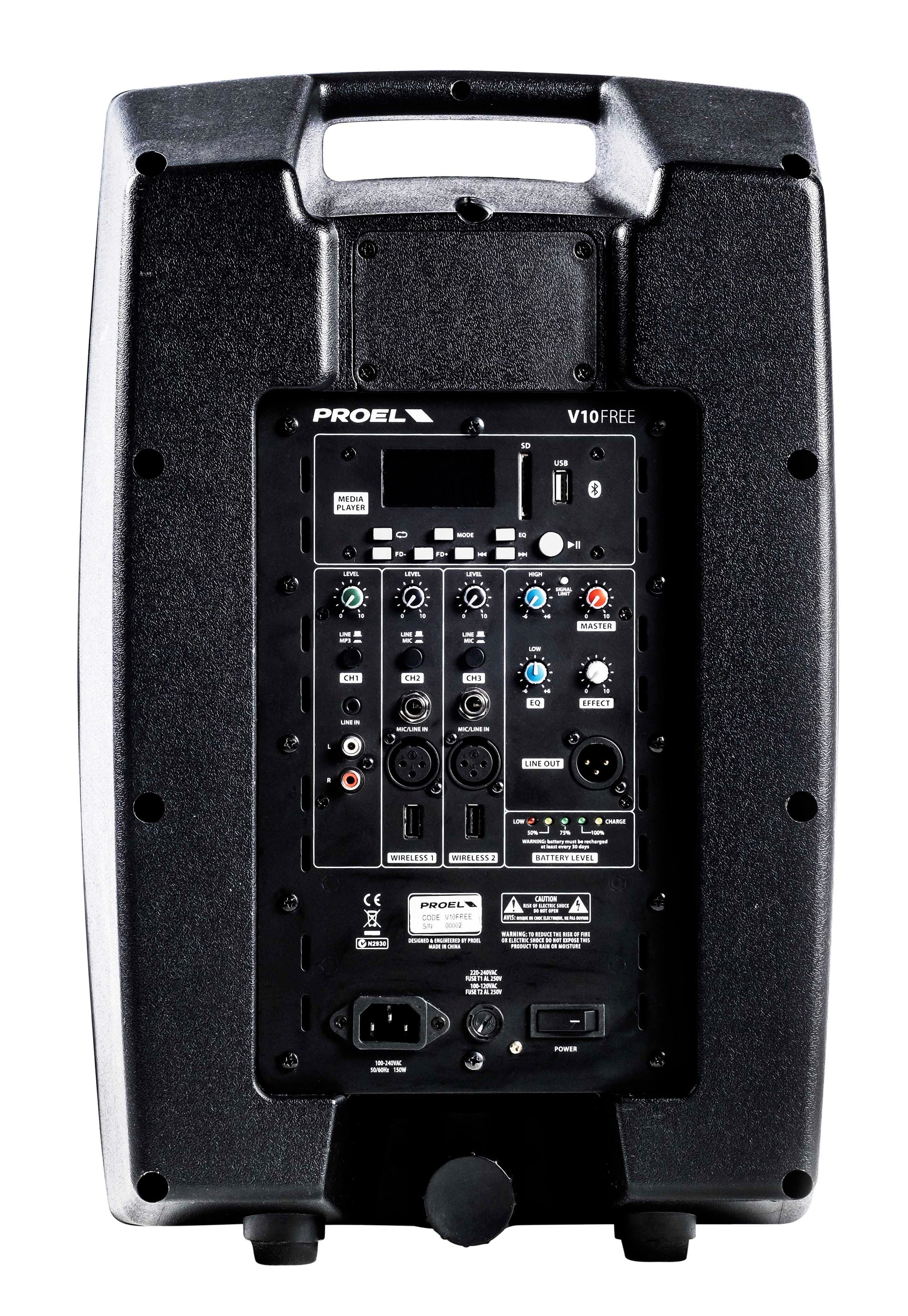 PROEL V FREE systems gives you the freedom to perform your music or play your sound anywhere, with a superb sound quality and without the hassle of laying down cables or finding a power outlet. V10FREE and V12FREE are battery-powered portable sound systems featuring a powerful 400W amplifier, a built-in 3-channel mixer with effect and tone controls and an advanced MP3 player with BLUETOOTH connectivity, featuring a large back-lit LCD display and able to play songs from SD card, USB MEMORY STICK or directly from your smartphone or tablet. They includes also two USB inputs for connecting PROEL U24H or U24B 2.4GHz Wireless Microphones with USB receiver, available both with handheld and bodypack transmitter. Just plug in the ultra-compact USB receiver and you can instantly use a professional wireless system, offering a high-definition, interference-free transmission thanks to the 2.4GHz technology.